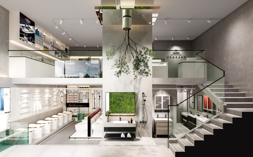 以极简工业风形态呈现,让粗放与产品精致形成鲜明对比,让人们意识到工业文明已经遍布生活的每一个角落,好的产品,才能让生活更舒适,入口绿植预示着昂昂生机,天花倒置的绿植树,寓意产品品牌,在疫情以及后疫情时代逆势生长,顺势而为。