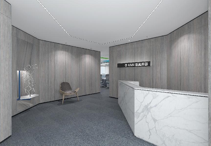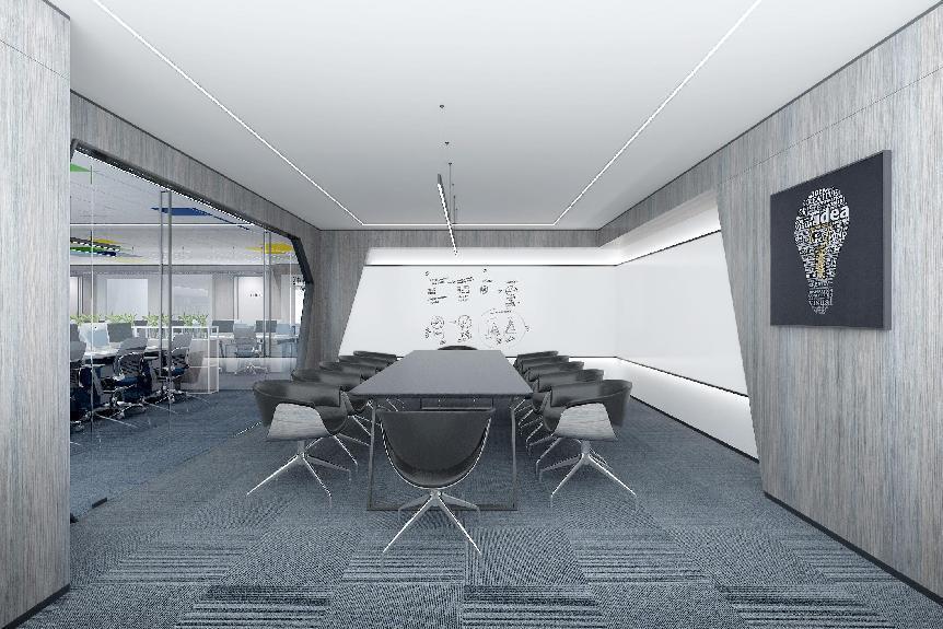 办公空间改造原接待门厅空间过于拥挤局促,对此空间进行了重新划分,布局做了钻石型斜面切割,破除了小空间的堵,增添了空间的导向感。