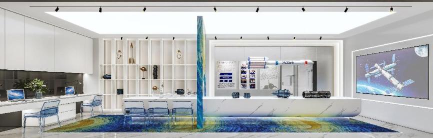 在这几十平米的展厅里,设计上融入了大师梵高的名画《星月夜》寓意浩瀚无垠的宇宙,展台似划破天空的火箭静态飞驰,打破壁垒,祖国的航天航空更加繁荣。