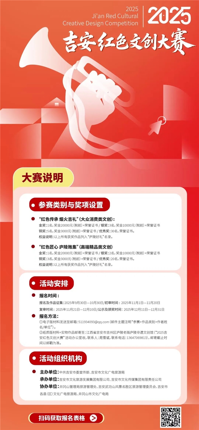 为策应井冈山革命根据地创建、三湾改编和人民军队诞生一百周年,贯彻落实中央和省、市关于促进文化和旅游消费的部署要求,助力“我的井冈行”红色研学活动开展,现面向全国公开征集优秀红色文创作品,举办2025年吉安红色文创大赛。本次活动旨在深入挖掘吉安丰富的红色文化资源,推动红色文化与创意设计、现代科技、市场需求深度融合,培育具有吉安特色的红色文创品牌,提升吉安市红色文化的影响力和竞争力,助力文化和旅游产业高质量发展。