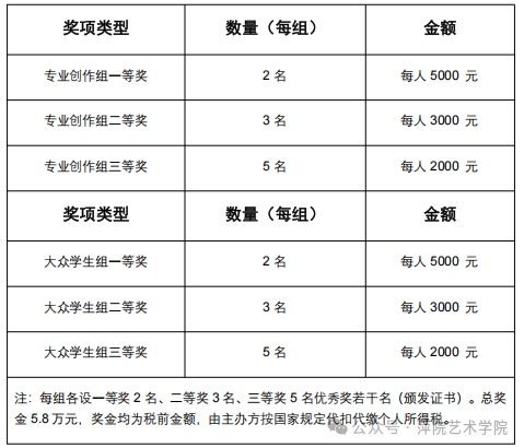 (二)奖励设置(总奖金 5.8 万元,专业创作组、大众/学生创意组奖项对称设置,每组各 2.9 万元)